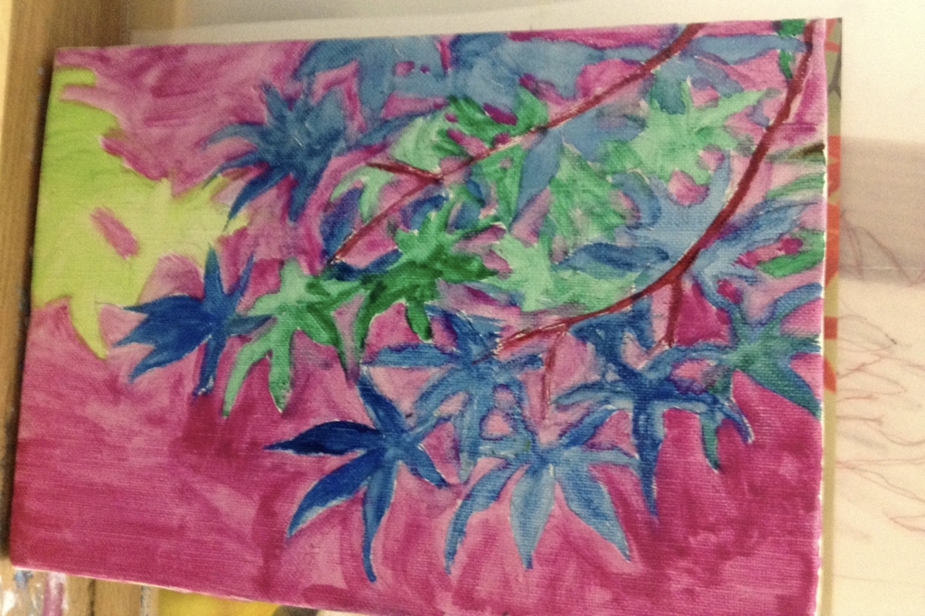 生徒さんの作品、秋にかざれるように、もみじの下塗り。